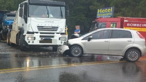 O Corpo de Bombeiros atendeu a uma colisão entre um veículo Punto e um caminhão Iveco na SC-135 na entrada do município de Pinheiro Preto. O automóvel Punto tin...