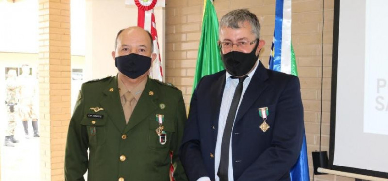 Procurador da República no município de Lages, Doutor Nazareno Jorgealém Wolff, e o capitão do Exército Brasileiro, Donizete Luiz Bianchini, oficial do 1º Batalhão Ferroviário de Lages, com a maior honraria que a PMA possui, a medalha Raulino Reitz. Foto: Divulgação.