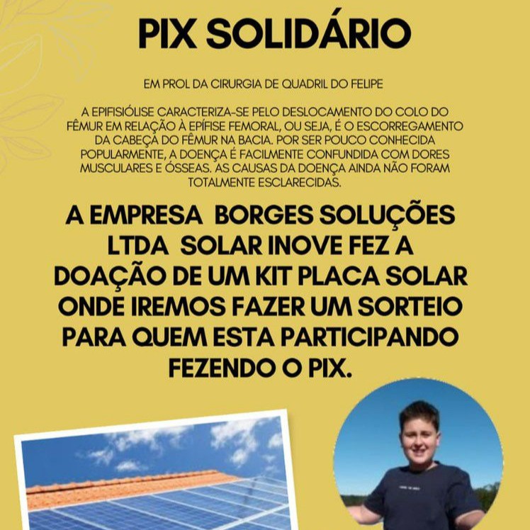 Quem puder contribuir, a família estará sorteando um kit de placa solar que foi doado pela empresa, Borges Soluções LTDA, basta fazer um pix de qualquer valor que vai estar concorrendo. Também vai ocorrer um sorteio de uma TV 40 polegadas e um vale compras de R$ 300,00 na Ponte Quente, para concorrer a estes dois prêmios, os interessados devem fazer um pix no valor de R$ 10,00. Os sorteios vão ser realizados no dia 14 de janeiro às 16h pelo Instagram, Daniela Anastacio que é a mãe do Felipe.
