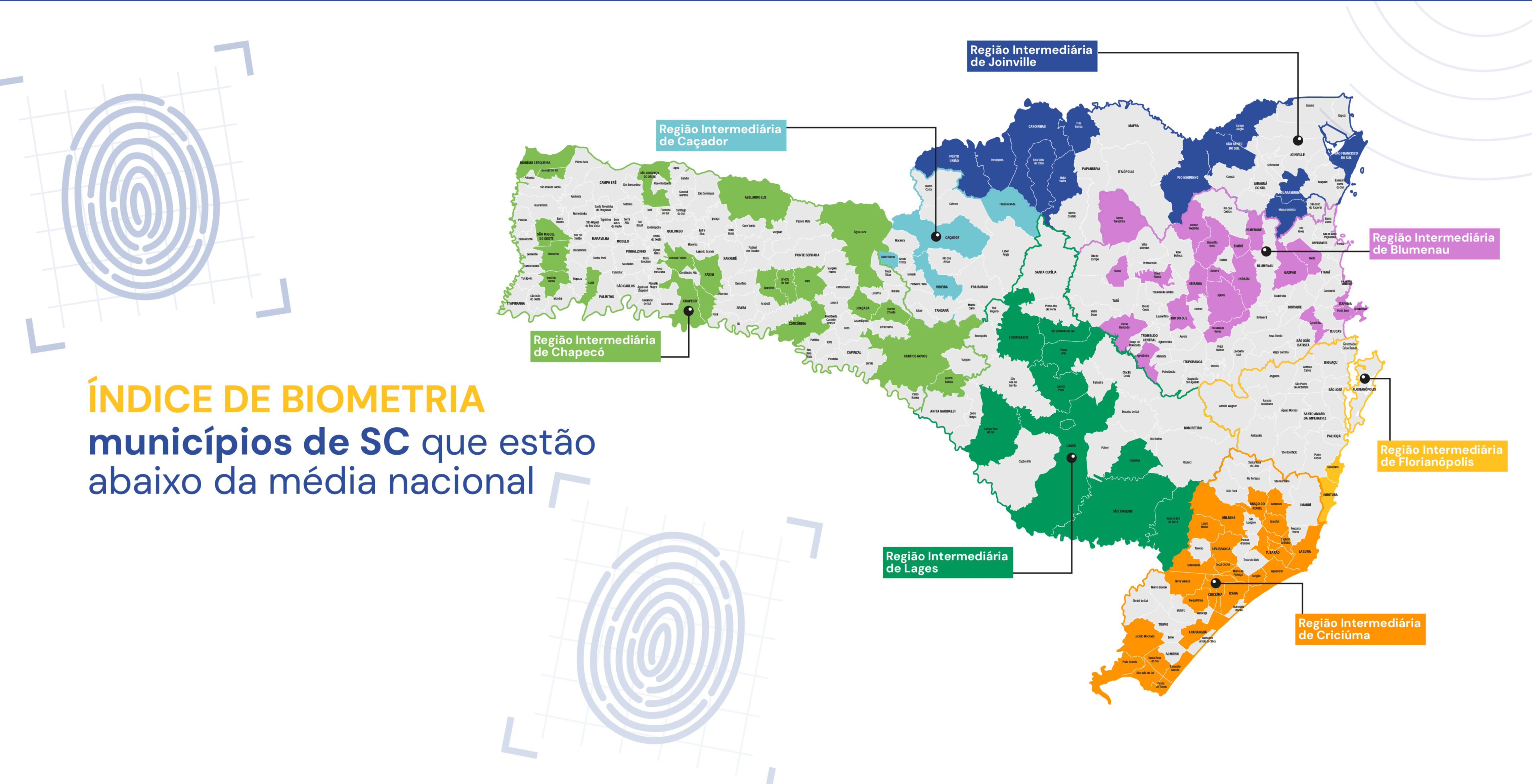 Dos 109 municípios da região intermediária de Chapecó, 20 estão abaixo da média nacional de biometria. Já entre as 16 cidades da região intermediária de Caçador, quatro estão “no vermelho”. Paralelamente, dos 25 municípios da região intermediária de Joinville, 12 estão abaixo do índice nacional. Na região intermediária de Blumenau, das 60 cidades, 22 também estão abaixo da média. Enquanto isso, dos 24 municípios da região intermediária de Lages, 10 estão abaixo do índice nacional. Já nas 44 cidades da região intermediária de Criciúma, 26 estão abaixo do índice brasileiro de coleta de biometria. Por fim, apenas duas cidades dentre as 17 da região intermediária de Florianópolis estão abaixo da média.