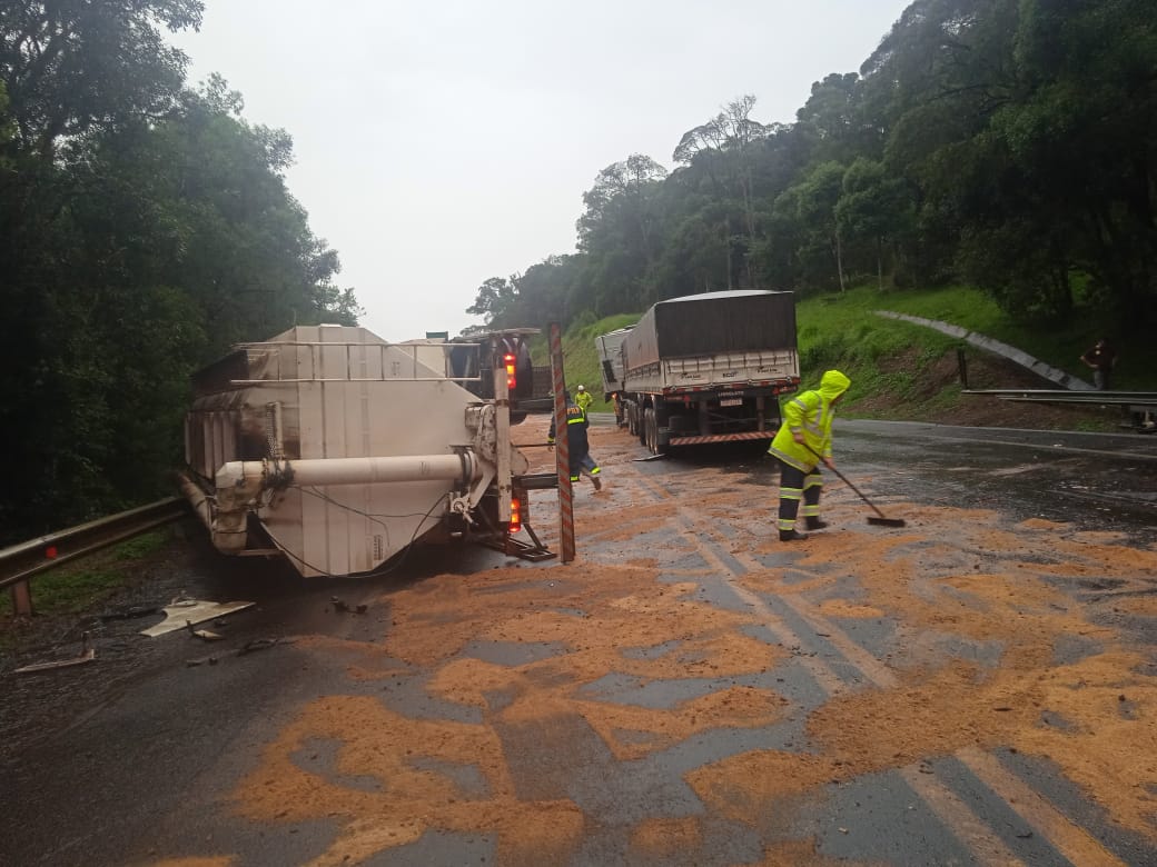 Com a colisão entre os dois caminhões, um acabou tomando. Um dos tanques de combustível furou e vazou o óleo sobre a pista. Os bombeiros fizeram a contenção do vazamento de combustível, deixando o local em segurança.