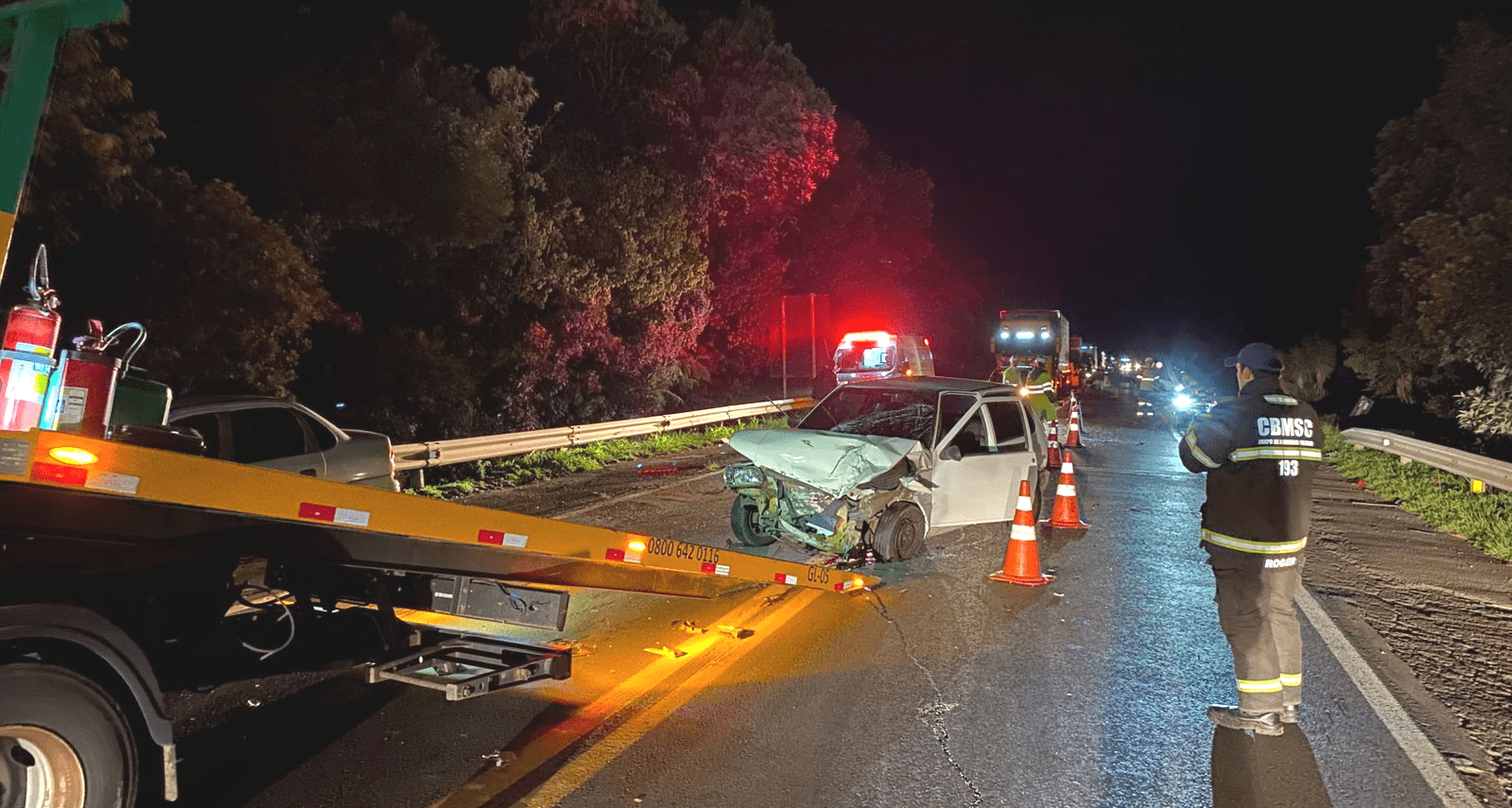 De acordo com os bombeiros, no local foi constatada uma colisão envolvendo quatro carros, sendo que dois veículos caíram em uma ribanceira, sendo o automóveis Fiat Uno com placas Mercosul, sendo que o condutor não foi encontrado no local do acidente e o Citroën C3 que transportava três ocupantes, o motorista, um jovem de 22 anos, já havia sido levado por meios próprios ao Pronto-Socorro e os outros dois, um homem de 50 anos e outro de 22 anos, ambos estavam conscientes, orientados e sem ferimentos aparentes, sendo atendidos no local e encaminhados pela equipe do ASU-571 para o Pronto Socorro e o terceiro veículo não se encontrava mais no local.