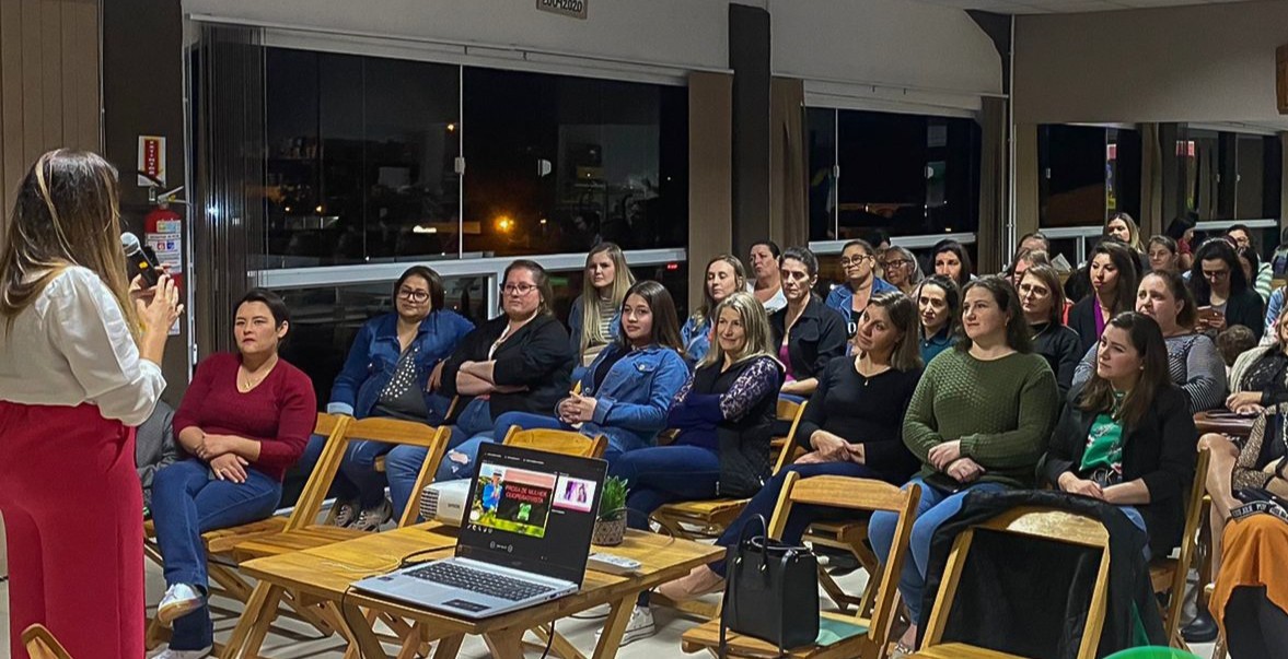 Durante a palestra, Caroline destacou o autocuidado, inteligência emocional e a importância das mulheres estarem inseridas no cooperativismo.