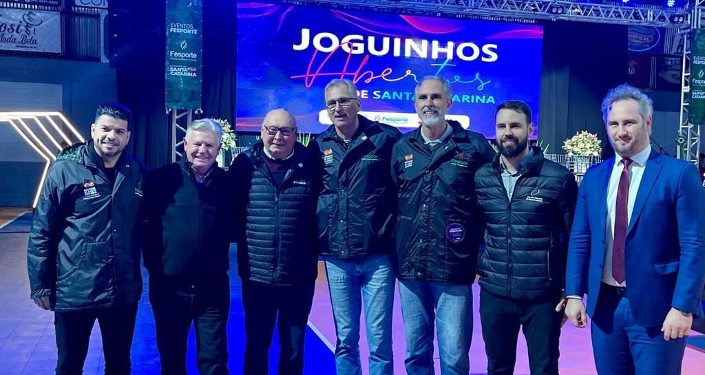 Deputado Berlanda na abertura dos Joguinhos Abertos de SC em Curitibanos, ao lado do Secretário de Estado da Educação, Aristides Cimadon, Presidente da Fesporte, Paulão do Vôlei e sua equipe técnica. Foto: Divulgação.