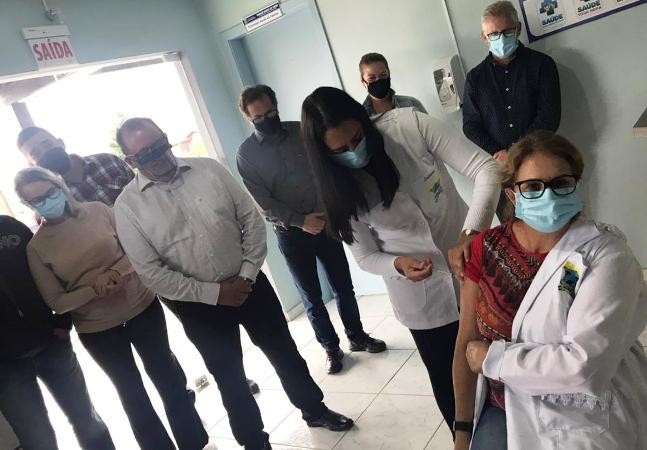 A primeira pessoa imunizada no munícipio foi a técnica de enfermagem Vera Lúcia Fernandes de 58 anos, profissional que atua há 25 anos na área da saúde do município.