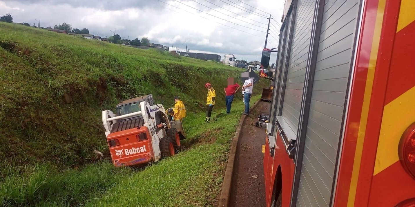 Na tarde deste sábado (17), o Corpo de Bombeiros atendeu a uma ocorrência onde uma Minicarregadeira sai da pista e acaba caindo em vala na BR-470 em Campos Novos.