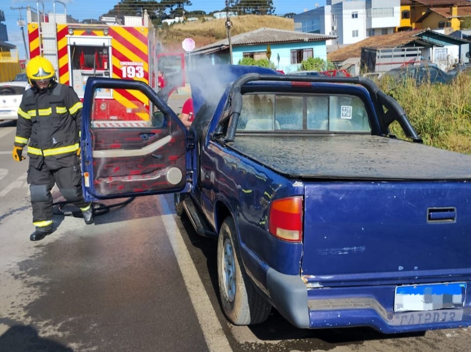 O Corpo de Bombeiros atendeu a um incêndio em um veículo Chevrolet S10 com placas Mercosul no Centro em Santa Cecília.