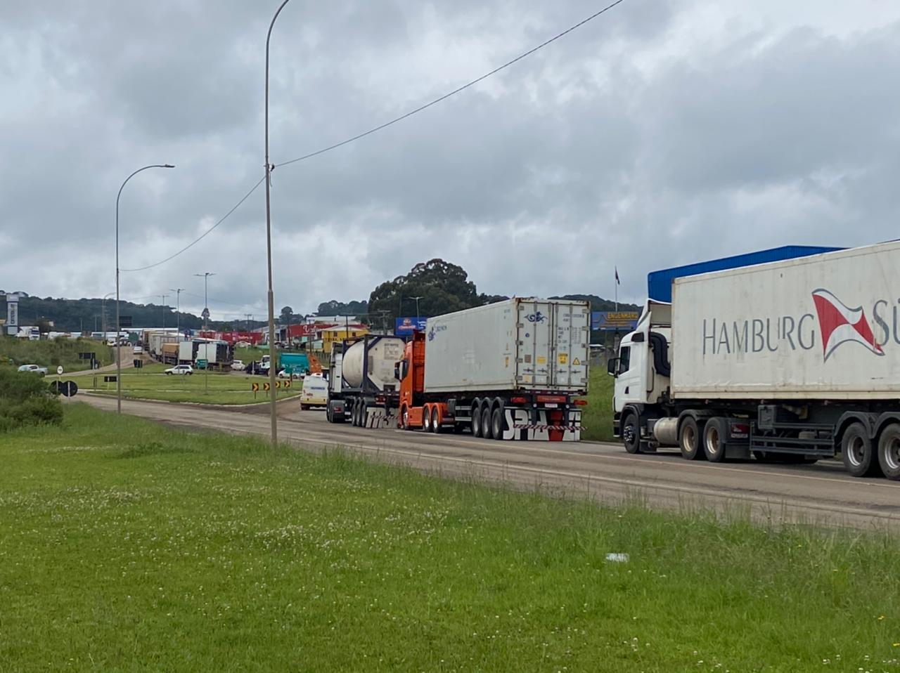 Em Curitibanos a BR-470 está totalmente bloqueada a passagem de veículos, a pista em ambos os sentidos tem fila e os únicos veículos com permissão de passagem são ambulâncias e os caminhões com cargas vivas.