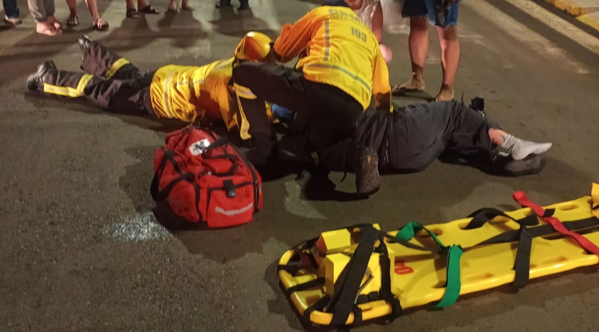 Conforme os registros dos bombeiros, o condutor da moto estava sob a via, sendo atendido pelos bombeiros e foi levado ao hospital com ferimento leves.