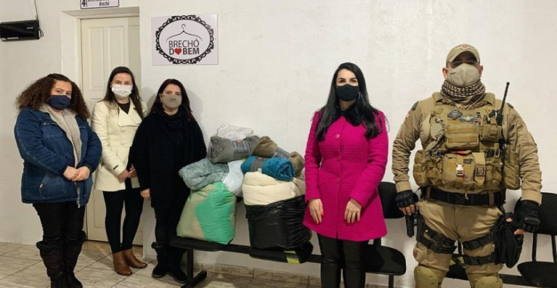 Foi arrecadado durante a campanha cobertores, mantas e edredons, novos ou usados e higienizados. Foto: Polícia Militar de Curitibanos.
