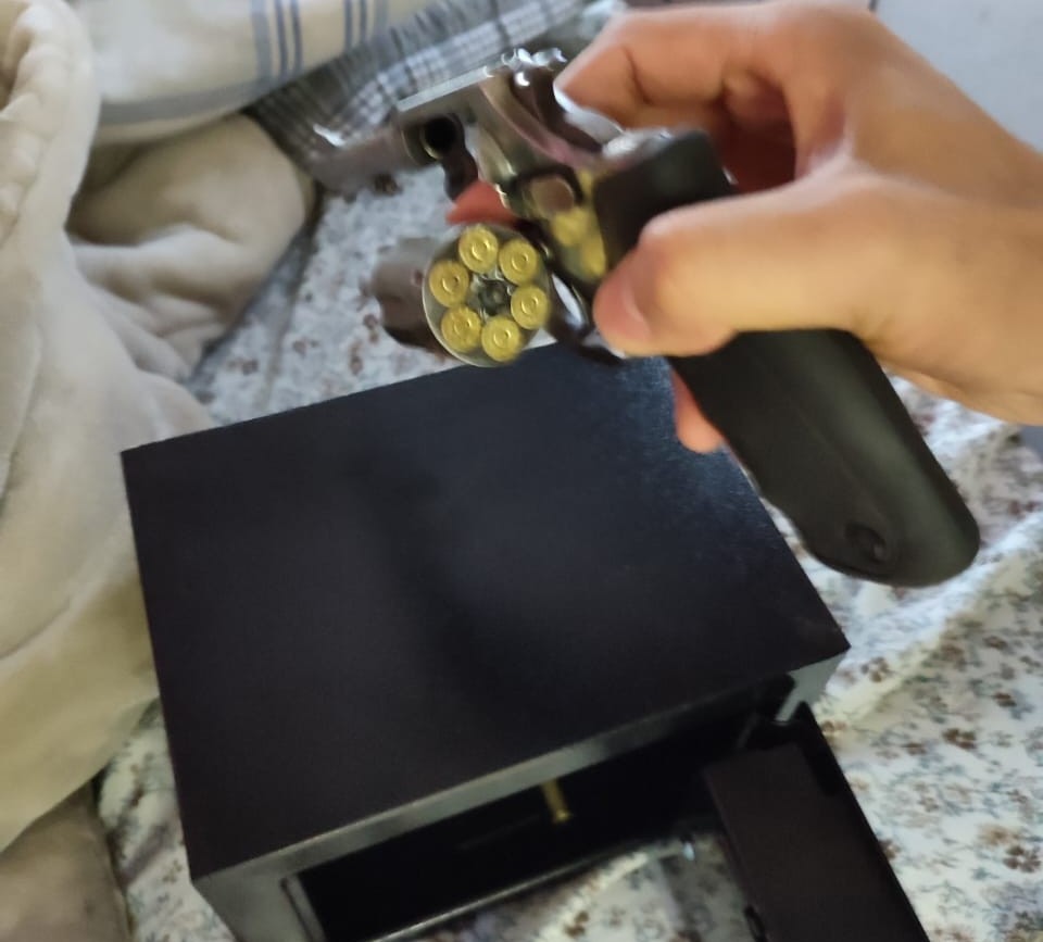 Durante as buscas no imóvel, os Policiais Civis encontraram uma arma de fogo e munições, sem o devido registro, as quais estavam guardadas dentro de um cofre junto com uma certa quantidade de “cocaína”.