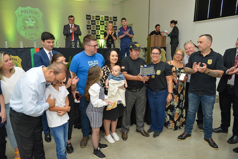Durante a visita do governador, Jorginho Mello (PL), nesta quarta-feira (29) em Curitibanos, na solenidade de entrega de viaturas descaracterizadas e equipamentos para a Polícia Civil, que foi realizado no auditório da Secretaria de Educação, o policial civil, Odilon Antunes dos Santos, foi homenageado pelos seus 40 anos de serviço efetivo.