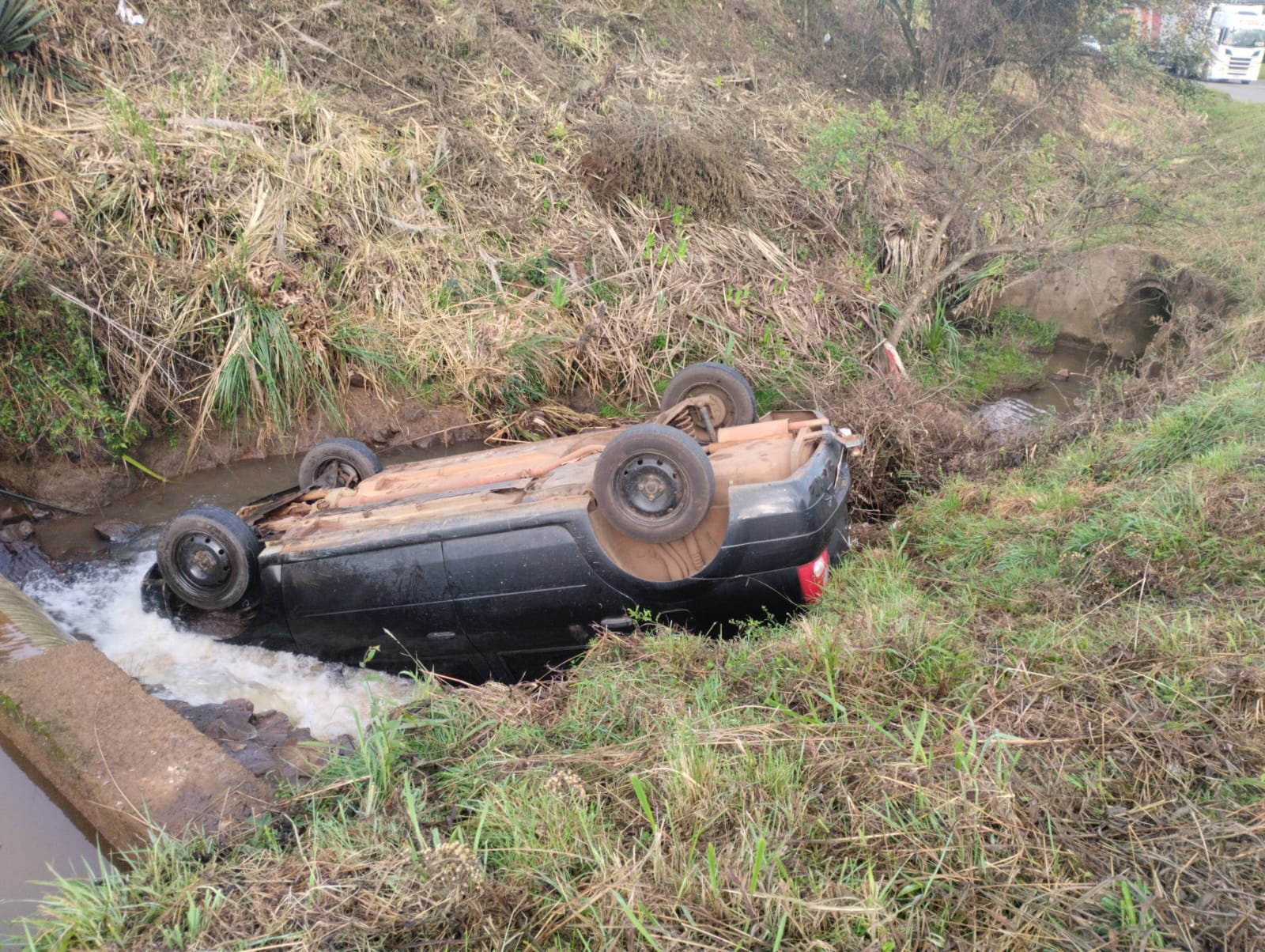 Nesta manhã de segunda-feira (18) por volta das 07h e 31min, o Corpo de Bombeiros atendeu a uma saída de pista seguida de capotamento em um córrego de um veículo Logan com placas de Curitibanos na BR-470 no trevo do acesso na área industrial em Curitibanos.